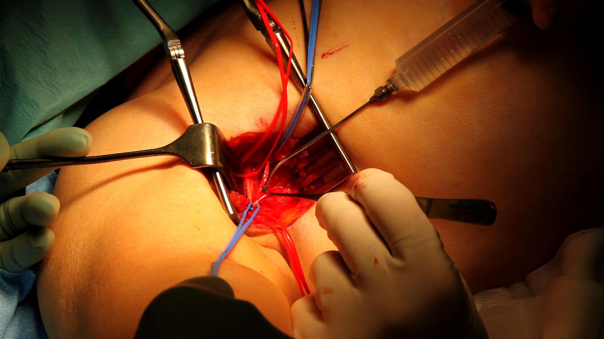 The pictures above and below both show the armpit, where the axillary artery and vein have been dissected and identified with colored rubber bands. These are unadjusted stills from the video. Shooting video with the MkII you only have manual control of focus and exposure compensation. Shooting this scene with the bright surgical light pointed straight at the wound, the camera stopped down to f/16, chose a shutter of 125 and ISO 200. Stopping down resulted in a quite deep depth of field (DoF). Not a problem shooting a scene like this, but if I wanted a more shallow DoF, that would be hard to obtain.