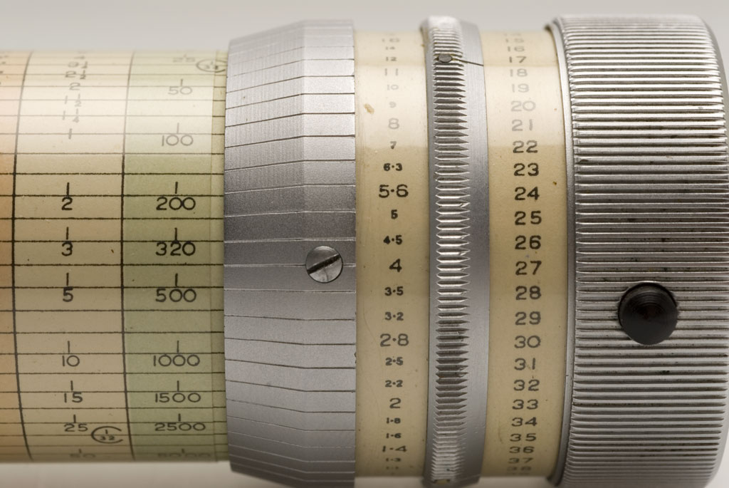The barrel with shutter speeds to the left and f-stops in the middle. For 1/200 the correct aperture would be ƒ/5.6. The numbers to the right are used to set the film speed (in British Standard Log speeds). Click to enlarge. Photo by Øystein Horgmo © All rights reserved.