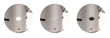 The comparing is done by looking through the 1,3x telescope. In it you see a spot in the center (actually smaller than the mock-up above). The spot is placed on the subject area you want to measure. You press a button to turn on the lamp, and then rotate the base of the meter to adjust the brightness of the spot. The correct measure is found when the spot disappears (above center).