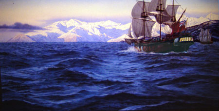 Captain Cook's ship "HMS Resolution" in Prince William Sound.